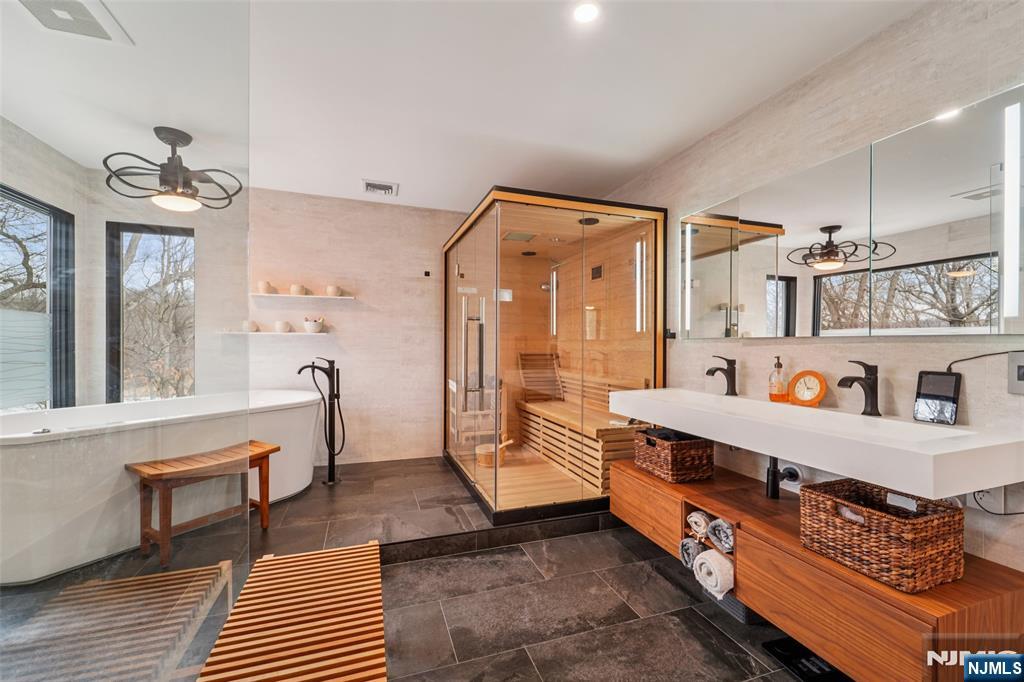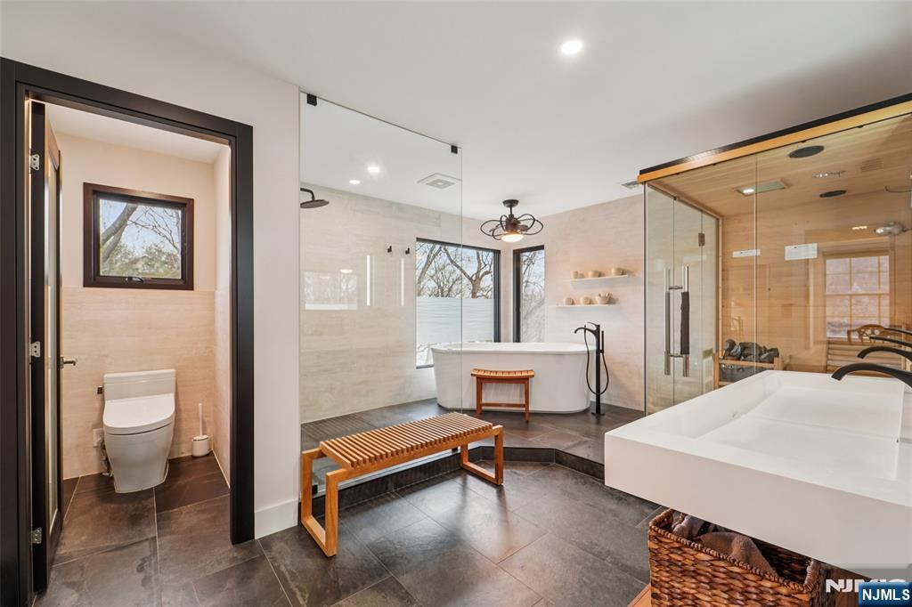 Experience lakeside living at its finest on the "Gold Coast" of Pompton Lakes. Set on nearly half an acre, this meticulously maintained Center Hall Colonial perfectly blends sophisticated entertainment spaces with everyday comfort, all designed to frame breathtaking water views from every angle. A grand foyer welcomes you to an interior defined by 10-foot and 2-story ceilings, newly finished hardwood floors, and seamless smart home integration. The main level offers a functional flow featuring a formal living room, a dining room with coffered ceilings, an eat-in kitchen, a great room with a fireplace, private home office and powder room. The upper-level primary suite is a true sanctuary, boasting a sitting room, dual walk-in closets, and a new spa-like bath with radiant heated floors, a sauna, a jacuzzi tub, and designer Porcelanosa tile. For entertaining, the expansive walk-out ground level features floor-to-ceiling windows, a recreation/billiards room, and a fully equipped wet bar. Your private backyard oasis awaits with a freeform infinity pool with a fountain and LED lighting, plus multiple patios offering a built-in kitchen, fire pit and outdoor lounge spaces. Complete with a spacious balcony with new Trex decking - the perfect vantage point for soaking in the scenery. The ultimate lakefront lifestyle awaits!