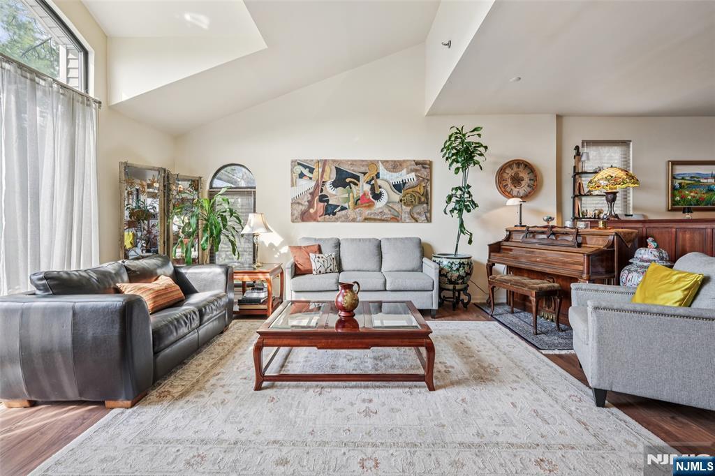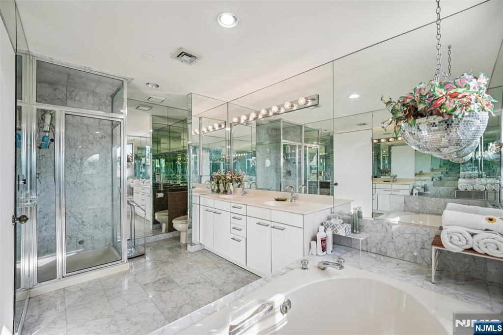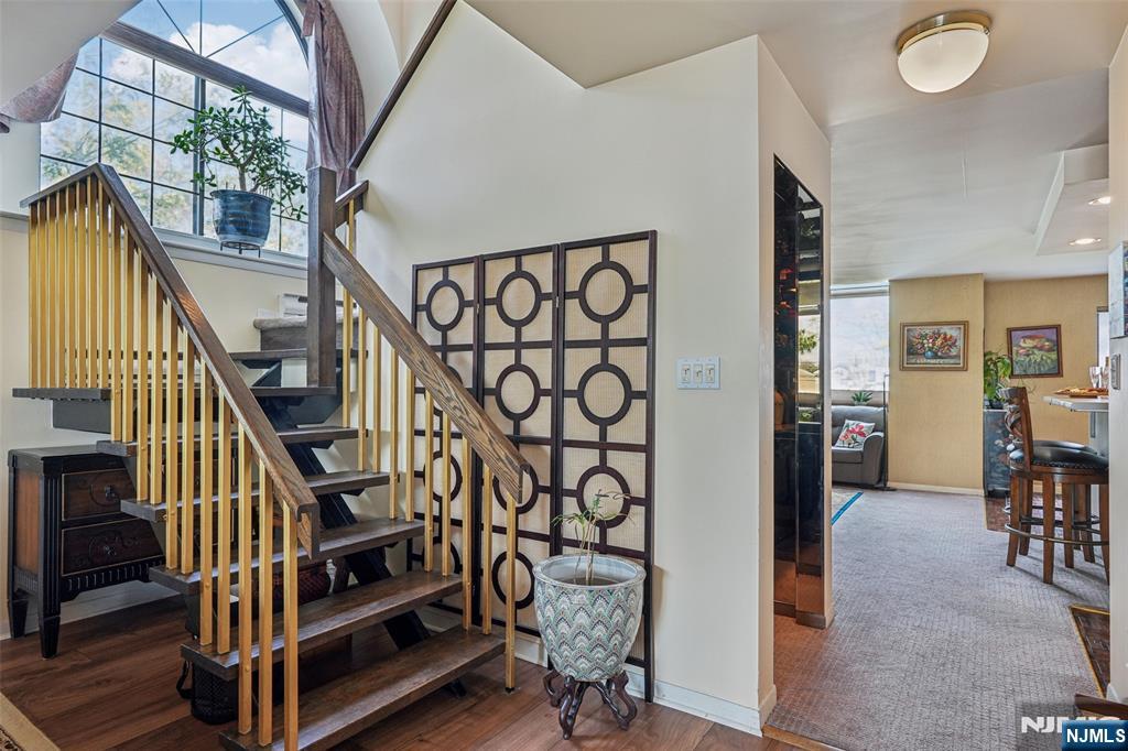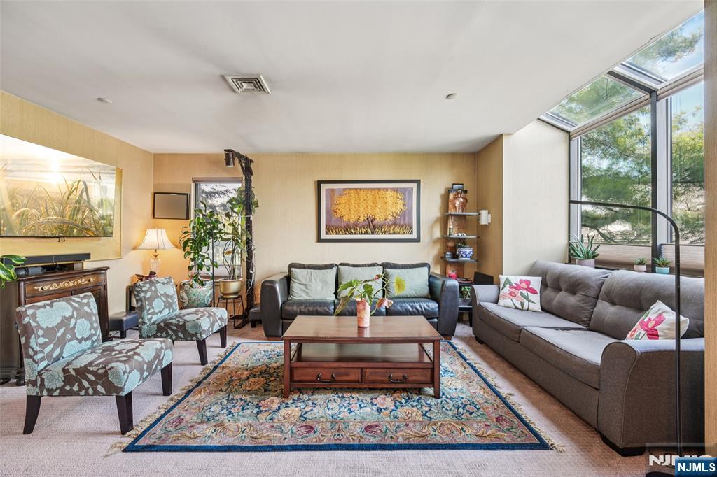 This rarely available, stunning corner end-unit duplex showcases an expansive, light-filled open floor plan designed for both comfort and style. The main level features a sophisticated sunken great room with a custom fireplace and oversized 10-foot sliding doors opening to a private balcony. A spacious dining area with chic built-in bar flows seamlessly into the family room and eat-in kitchen - perfect for both everyday living and effortless entertaining. A walk-in pantry and half bath enhance the space, while a private elevator provides direct access from the garage to the main level for the ultimate convenience. Upstairs, the generously sized primary suite offers a walk-in closet and a spa-like en-suite bath with a double vanity, glass-enclosed shower, and jacuzzi tub. Two additional well-proportioned bedrooms, a full bath, abundant closet space, and a dedicated laundry room complete the upper level. Located within Courts at Glenpointe, a prestigious gated community offering resort-style amenities including 24-hour security, pool, tennis courts, a community lounge, and beautifully manicured grounds. Enjoy extremely easy NYC commuting with an express bus just outside the gatehouse, only minutes to the GWB, and convenient access to all major highways!