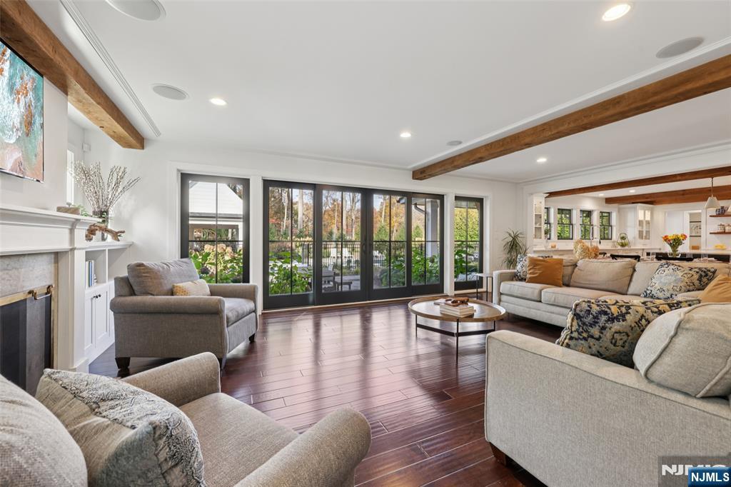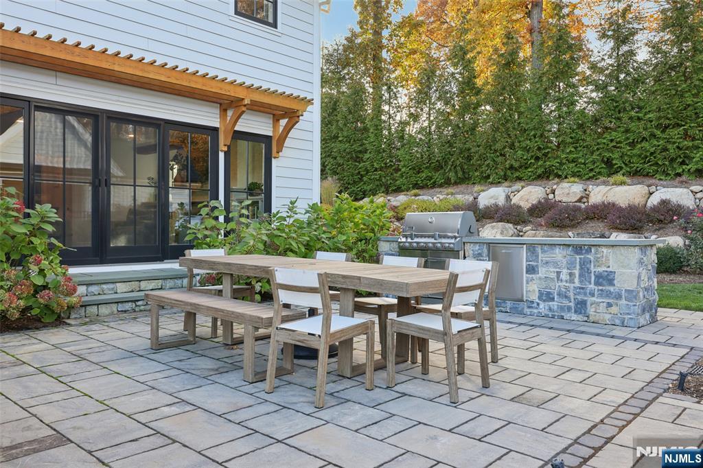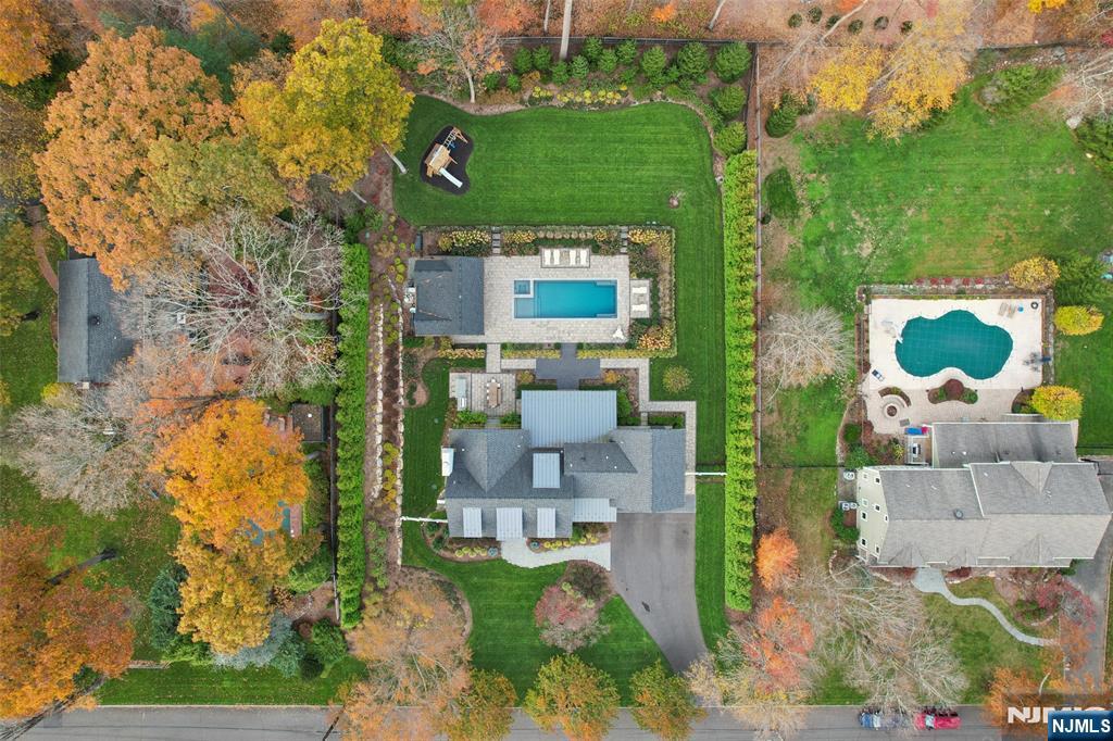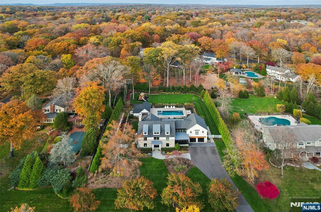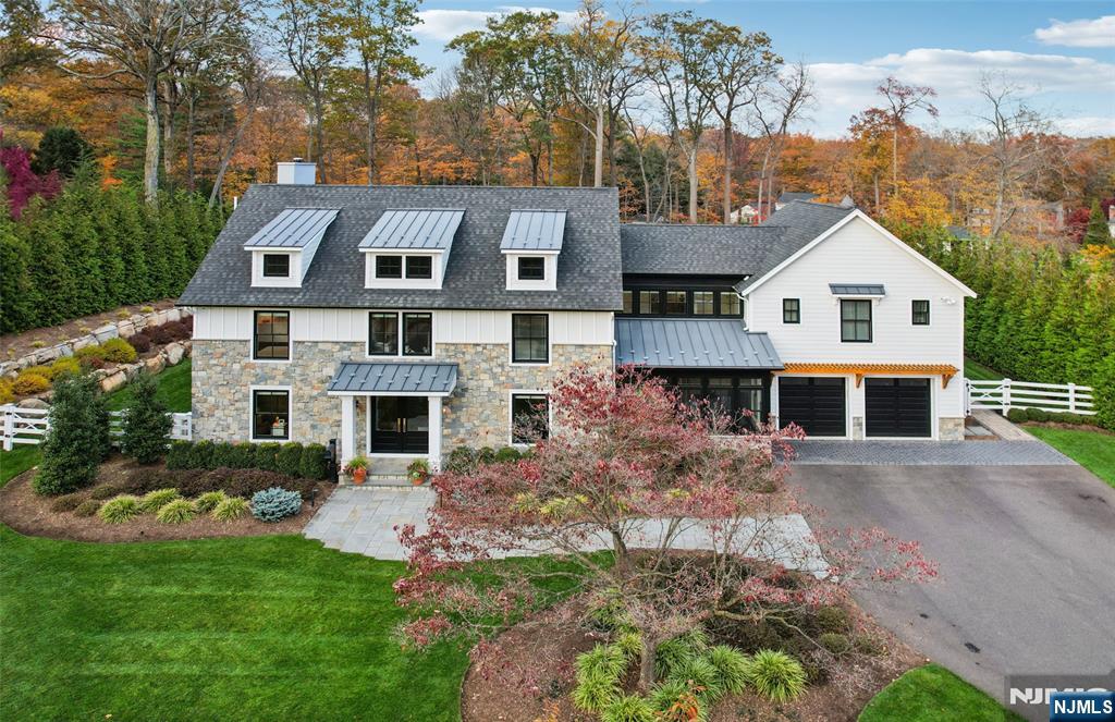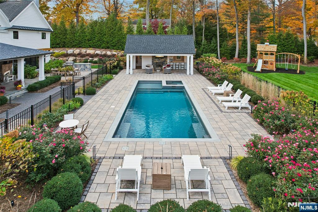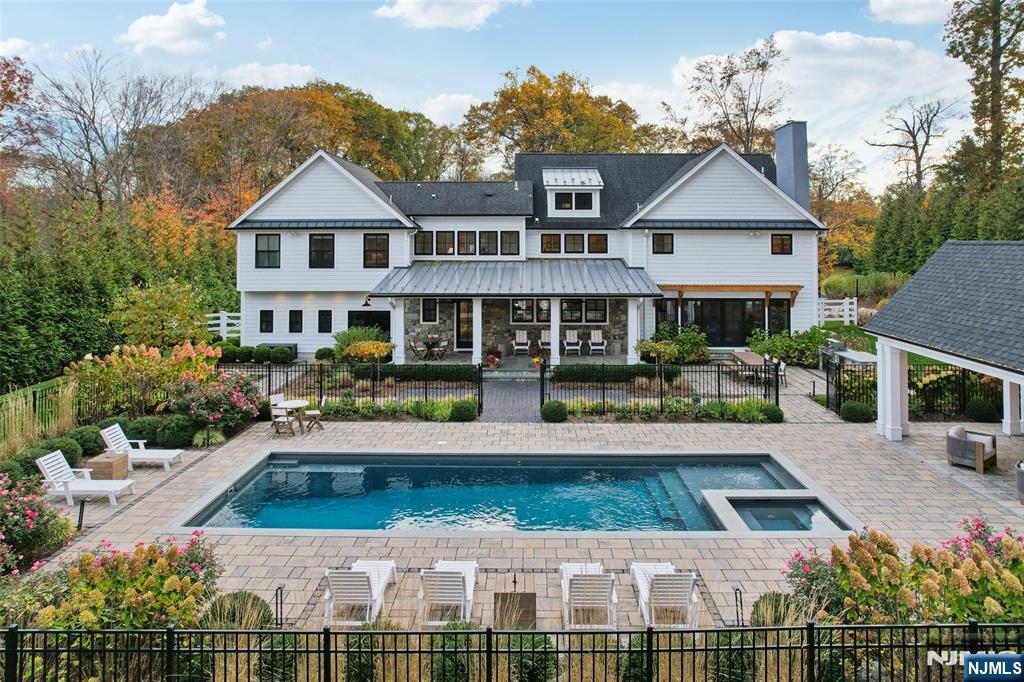 Discover the pinnacle of luxury living with this 2016 Modern Farmhouse, one of Allendale's showcase homes featured in numerous design magazines. Situated on 0.92 acres, this exquisite property boasts a new resort-style backyard with a saltwater pool/hot tub, a fully equipped pool house with an outdoor fireplace, blue-stone patio, built-in grill, and architecturally landscaped grounds. Inside, enjoy seamlessly flowing, light-filled living spaces adorned with designer features, reclaimed wood-beamed ceilings, and oversized windows. The heart of the home is a spacious open layout comprised of a gourmet chef's kitchen with WOLF/SUB-ZERO appliances, an oversized center island, leather-finish quartz countertops, and a family room with a fireplace and a wall of glass doors leading to a covered patio. The first level also includes a formal dining room, living room, private office, pantry, wet bar, wine/coffee bar, mudroom, and 2 powder rooms. Upstairs, the 4 generously sized bedrooms include a primary retreat with high ceilings, a large walk-in closet, and a spa-like bathroom. The impressive recently finished basement offers a carefully curated wine room/bar with a temperature-controlled cellar, a gym, a theater room with built-in surround sound, and a full bath. Located in a prime Allendale location with easy access to NYC transportation and top-rated schools, this residence masterfully combines entertainment appeal with everyday comfort.