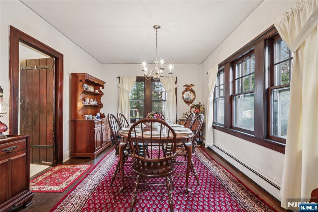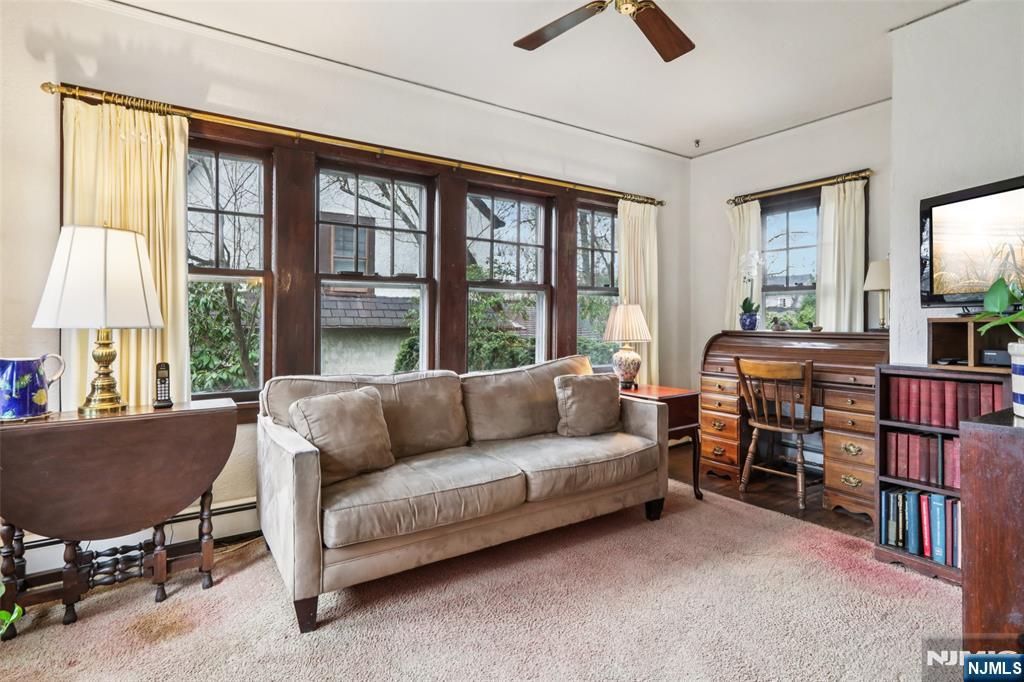 Welcome to the storybook charm of 476 Alpine Terrace! Nestled in an enclave of beautiful homes on a quiet tree-lined street in Ridgewood's premier Willard district, this 3-bedroom, 2-bathroom Tudor Colonial radiates warmth and character from the moment you enter. The entry with a distinctive stained-glass window greets you into a sunny layout with great flow, featuring hardwood floors and beautiful archways throughout. The first level consists of a light-filled living room with a classic stone fireplace, an elegant formal dining room, a kitchen with a breakfast nook/built-in seating, and a versatile den/office. All three bedrooms have sizable closets and are located on the second level with walk-up access to attic storage. The spacious basement provides exceptional flex space for a rec room, including a full bath and laundry. Outside, the property includes a detached 2-car garage, a stone patio, and a backyard framed by mature trees. Located just blocks from Willard Elementary and NJ Transit, this home offers unparalleled convenience. Opportunity awaits!